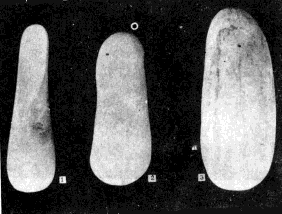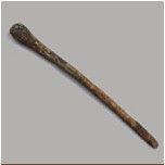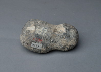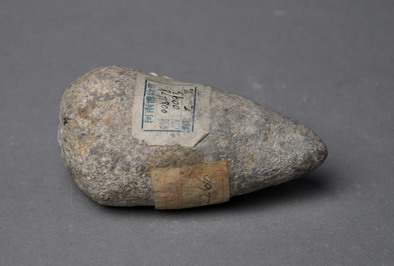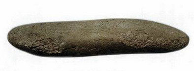 1960年河南省文物工作队在临汝发掘出土的商代石杵,长11.50厘米。天然鹅卵石制成,腰部稍有加工,首端粗大圆浑,后端亦圆浑较前略细。