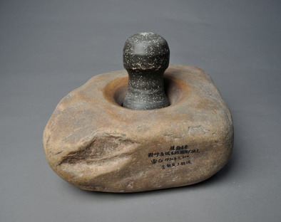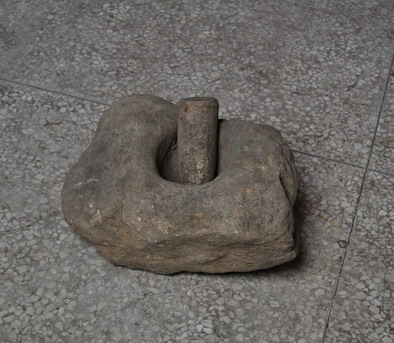 石杵臼,由石杵(chǔ)和石臼(jiù)组成,由青岩石磨制而成。石臼为不规则的半卵状,凹窝为椭圆形;杵为圆柱体,中间粗,两头细,通体磨制光滑。