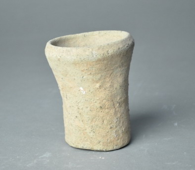 河南省南阳市镇平县出土的仰韶文化时期的陶臼,口径7.70厘米、高9.60厘米,口略敛,腹深斜,平底,加砂制成。