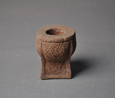 1960年河南省文物工作队在洛阳孟津发掘出土的一件汉代石臼,口径6.50厘米、高8.00厘米。红砂石质,上园下方的臼形器,上部刻有方格纹,下部为横及斜平行线组三角形纹饰。