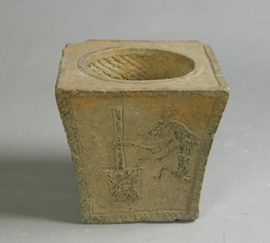1972年5月郑州新密市出土的东汉画像石臼,高32.00厘米、上边宽23.00厘米、下边宽17.00厘米。造像石臼上宽下窄,四周分别雕刻铺首衔环,玉兔捣药,人兽相斗,树木等。