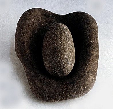 河南省南阳出土的屈家岭文化时期的石杵臼,砂石质,臼高21.50厘米、杵长18.40厘米、杵径6.00厘米、臼长37.50厘米,臼略呈菱形,臼面中心有一椭园式臼窝。杵为园锥体,一端平齐,一端较锐。