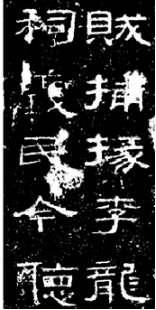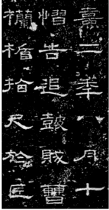 东汉晚期以后,隶书的字体逐渐趋于扁平,笔划间波磔明显,整体精炼工整,“平画宽结”“背分取势”是东汉晚期隶书的基本风格,使其呈横势扁方之态。这一阶段的隶书水平到达高峰,属于隶书发展的成熟阶段,直到魏晋以后,也无明显变异。张景碑是这一阶段的典型代表,此碑在章法上横有列、纵有行,显得庄重严整,字体鳞次栉比,排列整齐;且字距宽于行距,为隶书高度成熟时的通用章法,肃穆平整,合乎公文体的要求。但这种平整端庄又绝非死气刻板,为了增加艺术效果,有的字会突出笔画,如第十行的“府”字垂笔长过两格,这种拖笔之状犹如晴天霹雳,气势宏伟,不仅表现出书写者在情感上的爆发,而且打破了章法上的整齐划一之势,为全文展现出大气磅礴之感。其字体较其它碑刻而言略显扁平,但是长扁书写有序,毫无促展之意。长者不促之短,从“熹”“年”“曹”等字可以证实;扁者不过分夸张,如“月”“十”“尺”等(图3)。张景碑的笔法多为圆笔,笔画波挑间不显刻意,自然收放,笔道圆润,字多以圆笔起始,结字敛锋,如“追”“匠”等字末笔磔尾,把“蚕头雁尾”之意阐释地淋漓尽致。