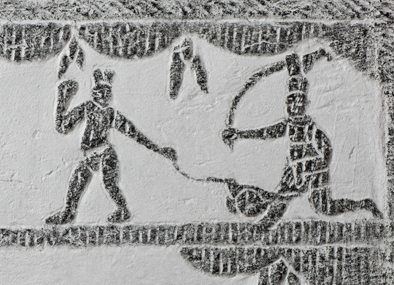 “许阿瞿”画像石画面中的“盘鼓舞”和“飞剑跳丸”即为汉代“百戏”中的舞蹈、杂技节目。盘鼓舞是汉代常见的一种舞蹈形式,数目不等的盘子和小扁鼓分散摆放在地上,表演者在盘鼓之间或之上做各种舞蹈动作。飞剑、跳丸是两种不同的杂技项目,跳丸在南阳汉画像石中是比较常见的,但飞剑跳丸却是首次发现,它把飞剑和跳丸两种杂技项目融为一体,增加了难度和危险性,使这种表演更具有了刺激性和观赏性。