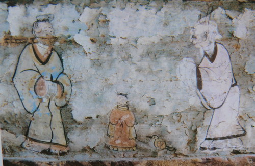 画像左边还用隶书字体阴刻出六竖行共136字的铭文,末两行有16个字因漫漶不能尽识,铭文内容为:“惟汉建宁,号政三年,三月戊午,甲寅中旬,痛哉可哀,许阿瞿身,年甫五岁,去离世荣。遂就长夜,不见日星,神灵独处,下归窈冥,永与家绝,岂复望颜。谒见先祖,念子营营,三增仗火,皆往吊亲,瞿不识之,啼泣东西,久乃随逐(逝),当时复迁。父之与母,感□□□,□壬五月,不□晚甘。羸劣瘦□,投财连(联)篇(翩),冀子长哉,□□□□,□□□此,□□土尘,立起□埽,以快往人”。文中的“建宁”为东汉灵帝的年号,建宁三年即公元170元。考建宁三年三月应为丁酉,石刻铭文戊午可能为误作。三月十八日为“甲寅”,据铭文记载,可能为墓主人的死日。铭文记述了许阿瞿死亡的情况和家人对死者的悼辞。画像中的小主人名叫许阿瞿,他生下来就体弱多病,家人为他治病花了不少钱,最终也未能保住幼小的生命。东汉灵帝建宁三年(170年)三月十八日这一天,年仅五岁的许阿瞿不幸夭折了,家人为其举行了隆重的葬礼,亲朋好友都前来吊唁。许阿瞿的父母梦见其刚刚死去的幼子不识亲人,四处游荡,啼哭不止,孤单无伴,甚是悲悯,以为原葬处风水不佳,只好迁坟重新厚葬,并请石匠画工把许阿瞿生前的娱乐场景以及名字、去世的日期、家人的哀悼之辞一并雕刻在墓壁石上,希望许阿瞿幼小羸弱的灵魂能得到列祖列宗的照顾而和生前一样的幸福快乐。