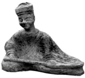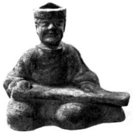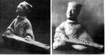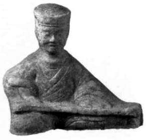 四川出土的其它东汉弹琴俑。新皂抚琴俑(图13)[27],1952年四川绵阳新皂乡东汉崖墓出土,琴置于抚琴俑膝上,琴有岳山,尾端无柄,箱体修长而无弦柱,可证其非瑟而为琴无疑;资阳抚琴俑(图14)、乐山抚琴俑(图15)、彭山崖墓抚琴俑(图16)、彭山弹琴俑(图17)[28]。这些弹琴俑所弹古琴的箱体为明显的全箱式。