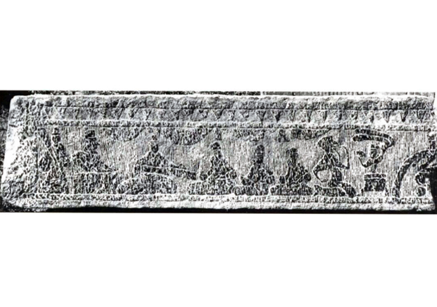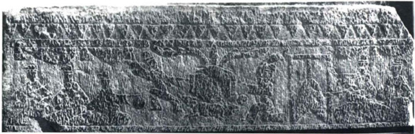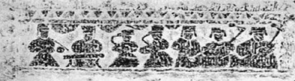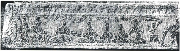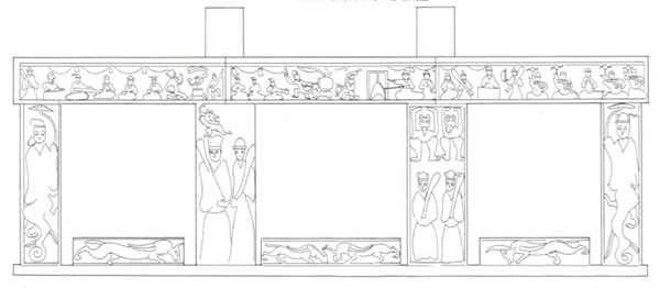 左门楣石刻。该块画像石上共刻有9个人物,画面分成两部分:右半边刻有5个人物,为表演者,中间一人似吹埙,其余四人皆吹排箫播鼗鼓;左半边刻有4个人物,为观乐者,其中一人坐于案前,两旁有三名侍者,二人执金吾和便面,另一人端坐。