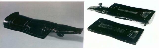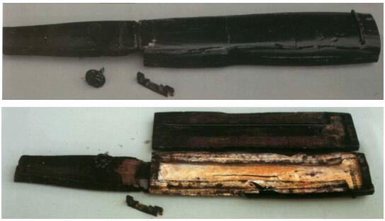 马王堆七弦琴(图10)[19]。西汉早期,湖南省博物馆藏。通长81.5厘米、通高13.3厘米、宽12.6厘米。木质,无徽,底平,外表髹黑漆。琴体近长方体形,由琴身和底板两部分组成,琴身又可分音箱和尾板两部分。“此琴面、底之间的T形凹槽,可能是后世琴上两个共鸣窗(箱)及轸沟(轸池)的前身,琴上的岳山、轸池、焦尾、七弦、七轸等均与后世的古琴相似”[20]