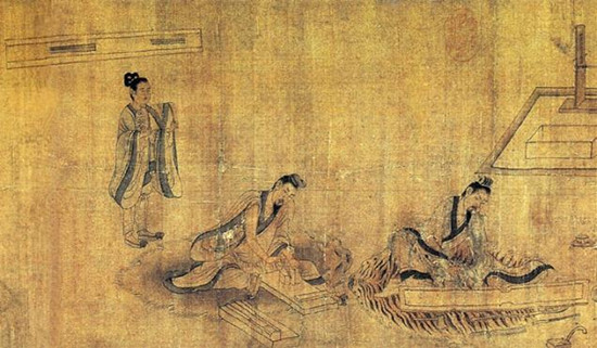 《斫琴图》(图18)[29]。东晋,现藏故宫博物院。顾恺之原作,现存作品疑为宋人摹本。绢本,纵29.4厘米、横130.0厘米。图中描绘了斫琴的场景,大体分为制作琴坯、开挖槽腹、制作岳尾、设弦审音等四个部分,附带有制造琴弦的情景。图中明显可以看到合琴前的琴面和琴底,琴面和琴底呈全箱式、长短也基本相同,并且在底板上清晰显示有龙池和凤沼设置。