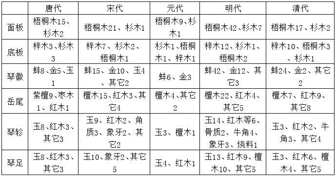 笔者通过查询现有文献,共搜集整理到157张有明确年代的传世历代古琴实物的琴材资料,其中唐代17张、宋代33张、元代10张、明代68张、清代29张,详情见表1。面板用木材,有梧桐木和杉木两种,其中绝大多数为梧桐木,均自唐代起就开始使用;底板用木材,主要有梓木、杉木和梧桐木三种,其中梓木占大部分,梓木和杉木底板始自唐代起,梧桐木底板始自宋代;面板和底板用木材的年轮线,有较密的、也有较疏的,有较均匀、也有差别较大的,有经过髓心的、也有不经过髓心的,说明古人对面板和底板用木材的年轮情况和心材边材不是太重视;面板用木材的纹理,多数都比较均匀、顺直;琴徽用材,绝大部分是蚌,其次是金,还有少量的玉、翡翠、铜、石、玛瑙、瓷、银等;岳尾用材,绝大多数岳尾的材料一致,以檀木、红木等硬木材料为最多,还有部分的枣木、酸枝木、花梨木等,另外有少量岳尾材料不一致,其中岳山材料有水晶、玉、象牙等;琴轸用材,以玉为最多,部分为红木、象牙、牛角等,还有少量的玛瑙、檀木、竹、乌木、烧料等;琴足用材,以玉为最多,部分为红木、檀木等,还有少量的牛角、乌木、象牙、玛瑙、牛角、酸枝木等。