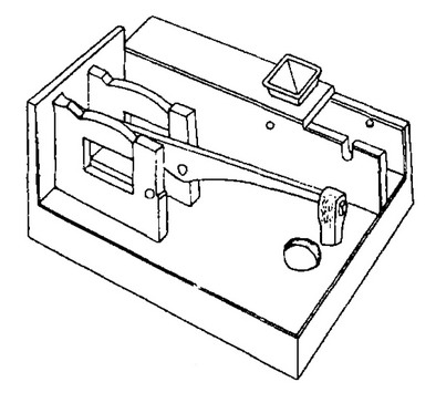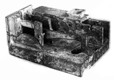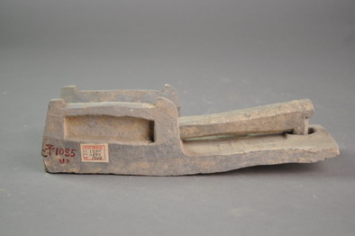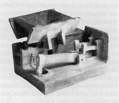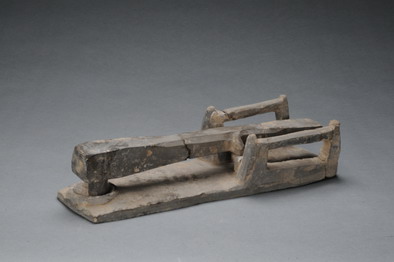 1982年河南南阳市博物馆在南阳市东郊征集到一件西汉时代的灰陶风扇车模型,风车模型整体呈长方盘状,全长46.5厘米、宽22厘米,盘四周为矮墙,左下角有出入口,盘一头有圆形臼窝,为舂谷之处;左下角处有一风箱,风箱呈长方体斜坡形,一头为进谷口,另一头可能为出糠口。⑩