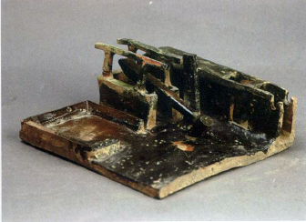 2003年5月,济源市文物部门对位于沁河北岸西窑头村的汉代古墓群进行了抢救性考古发掘,其中在M10中出土了一件褐釉簸箕和一件褐釉陶风车。褐釉簸箕:釉陶质,模制,长11厘米、宽8.5厘米、高2.5厘米,箕身呈前宽后窄的三角形,底部无釉并模印网格纹,其余施褐釉;褐釉陶风车:釉陶质,边长22. 5厘米、高6.5厘米,方形台板上一侧置放一陶风车,一陶踏碓与陶风车并列置放,风车箱体呈长方形,一端上方有一长方口用来置放盛粮用的高槛,高槛缺失,前方一侧有一长方形出粮口,正前方没有封闭,为秕(bǐ)糠出口,一侧站立一俑在摇风扇轮。陶踏碓整体呈长方形,长方形碓座上两侧各有一长方形碓架,碓正前方有一方形孔,用于置杵,杵缺失,碓正前方有一圆形杵臼窝,踏碓旁还有一留有出口的方形低挡墙,用于盛放净粮,风车整体施褐釉。⑬