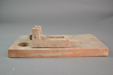 1983年,河南省文物工作队在济源泗涧沟发掘出土了一件汉代的红陶杵臼盘(碓),杵臼盘长35.00厘米、盘宽21.00厘米、杵架长13.30厘米、杵架高6.70厘米、盘厚3.00厘米。杵臼盘呈长方体,一隅处有一圆形径为4.7厘米的圆窝,杵架长方形,一端立四方柱支架,附一杵尾头。
