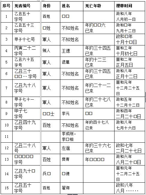 年龄:滑县漏泽园留下年龄者从十二三到四十五六不等,基本都为青壮年,其中一半以上是军人。滑县临近黄河故道,北宋晚期这里经常发生决堤事件,而政府又视此地为阻挡辽军南下的重要河流屏障,所以朝廷常征调大量的民工和军士来此修筑水利以及军事防御设施,这些人很可能就是在这些繁重而危险的工作中英年早逝的。