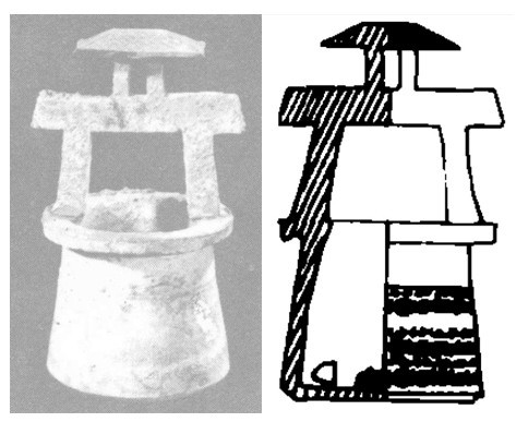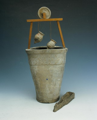 1953年,洛阳市烧沟45号墓出土的陶井模型[3](图七),西汉晚期,井身为长筒形,平底,口大于底。井栏椭圆形,模印有菱形、圆圈等图案花纹,置于井筒上部。井栏口较井口为粗,高度约占井身模型的三分之一,井栏与井筒连在一起。井栏口沿左右对称有二长方形孔,用以安装井架(此为后配木质井架)。与井同出的还有带绳槽的滑轮一、水槽一、卷口沿小罐二,可缚绳汲水。