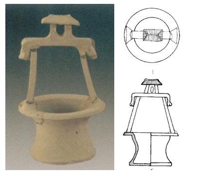 各种形状的汉代陶制水井模型,均为随葬明器。常与陶仓、陶灶等成组出土。陶井模型始见于河南等地区的西汉武帝时期的墓中,此时的陶井模型形制简单,无陶质井架,井身仅作筒形,平底,井身上部约三分之一处有井栏,栏口呈圆形或椭圆形,并印有各种各样图案。西汉晚期,井身逐渐变矮,有的仅有井栏而不见井身,井栏呈方形或长方形。