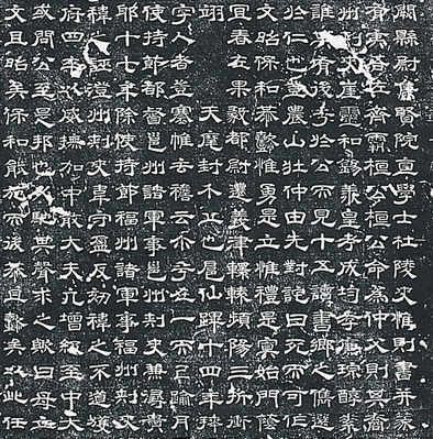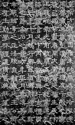 东汉是隶书的鼎盛时期。《韩仁铭》、《甘陵相尚府君碑》(图五)、《肥致碑》皆为汉隶代表之作。汉隶强调横和捺的装饰作用,从而形成了波势和折尾,显得舒展多姿,气象外耀。和篆书相比,变篆书的圆转为方折,把弧线拉直,增加了笔的停顿,从而使笔划有了粗细巧拙的变化;汉隶的另外一个特点是其形状取势为扁方横势,布列均匀平整,给人以高古典雅的神韵。此时出现了第一位书法理论家蔡邕,他以标准汉隶刻写《熹平石经》(图六),以为楷模。