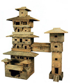 陶楼是东汉墓葬中常见的随葬品,楼阁的塑造也与时人求仙思想有密切联系。(图11)武帝好求仙,公孙卿就说,“仙人可见,而上往常遽,以故不见。今陛下可为观,如缑氏城,置脯枣,神人宜可致。且仙人好楼居。”[16]于是武帝在长安、甘泉一带大造高楼。在长安造的高楼称“蜚廉桂观”,甘泉的则叫“益延寿观”,后来又在甘泉造了的“通天台”,时刻等待仙人的降临。[17]可见,楼是接近仙人的工具。《论衡•道虚》中所说“为道学仙之人,能先生数寸之羽毛,从地自奋,生楼台之阶,乃可谓升天”[18],由此可见,楼台的意象应与升仙有关。