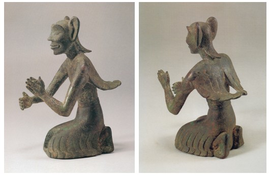1966年,在陕西西安南玉丰村汉城遗址上,南距长乐宫北宫墙不到5米处,出土了一件青铜羽人小雕像[15](图9),高15.3厘米。羽人跽坐,身体微倾,背生双翅,翅上饰卷云纹,两长耳竖立,颧骨与眉骨隆起,深目高鼻。羽人两臂前伸,双手作抱物状,两膝间有半圆形竖孔,底部有一小孔,原来应该手持物件。