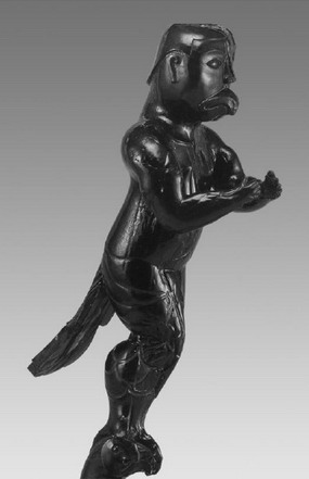另外,羽人高鼻深目,拥有异于当时中原人的面部特征,《淮南子•道应训》中记载秦始皇时的方士卢敖所见神仙即“深目而玄鬓,泪注而鸢肩,丰上而杀下。”[3]另外,汉通西域后,外域人士相对于当时的中原人“面目奇异又擅长各种幻术杂技”[4],这件羽人其容貌具有异域人物的特征,一定程度上反映出中原和外域的接触,以及彼此在文化上的交流与融合。