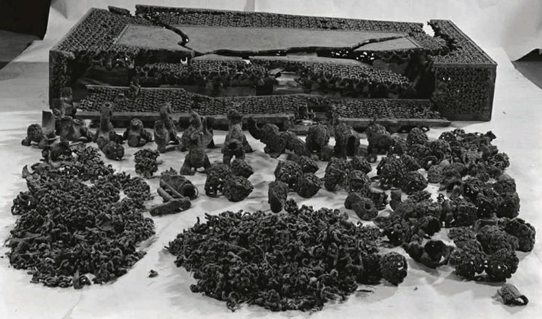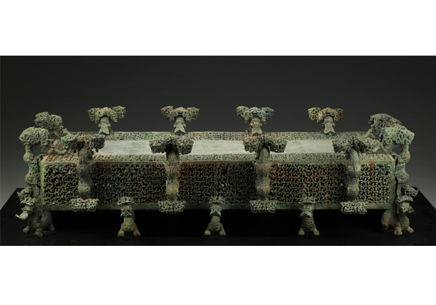 底座四角及禁下端承托铜禁的12个座兽的臀部上方有12个浇口,浇口处留有残柱。在禁侧底边每两个座兽的中间点有12个冒口痕迹。再根据禁面及禁体四周上有明显的分界线以及云纹重复出现的规律性,分辨出是由24块带云纹图案的蜡模和禁面中间一块平面蜡模共25块蜡摸组成。禁体没有合范缝隙,也没有铸接、焊接的痕迹,有的铜梗相互缠绕、弯曲,铜梗粗细以及交接处有手捏的痕迹,不规整。从现代铸造技术来看,云纹铜禁只能是失蜡法铸造而成,在5厘米的厚度空间中呈现这么复杂的结构,范铸法根本无法脱模。据此分析,禁体是将25块蜡模拼接在一起,边缘用蜡焊接,整体制范后将范翻转,采用失蜡法一次浇注而成。