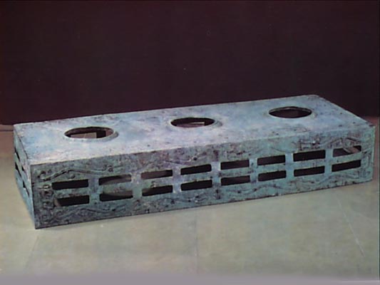 1901年在陕西宝鸡斗鸡台出土了一批青铜器,最初由端方收藏,后流入美国,现藏于美国纽约大都会美术博物馆。该器扁平立体长方形,无足,禁面素面,前后两边侧壁各有两排8个穿孔,左右各有4个穿孔。长87.6厘米,宽46厘米,高18.7厘米,泥范法铸造。四周及侧面饰夔蝉纹。年代应为商晚期至西周初期。