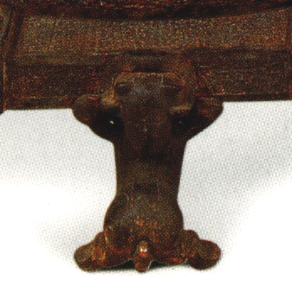 曾侯乙墓铜联禁对壶(图5)于1978年在湖北省中北部的随县擂鼓墩发掘出土,现收藏于湖北省博物馆。扁平立体长方形,禁长117.5厘米,宽53.4厘米,高13.2厘米,重35.2千克,时代为战国早期。禁面前后长边对称有四个足兽(图6),是分铸后焊接在禁面下。禁面上有两个并列凹下的圆圈,出土时联禁大壶一对放置在两个圆圈之上。