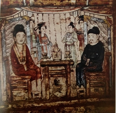 如(2):隋徐敏行墓[5]开皇四年(584年)壁画(图三),山东博物馆藏,山东嘉祥英山徐敏行墓出土,横93厘米,纵74厘米,徐敏行夫妇端坐于榻上,身前置条形几案,背后设屏风,绛帐拉开,垂悬于榻两旁。屏风、帐、榻、几案的组合亦是北朝时期风尚所趋的表现。