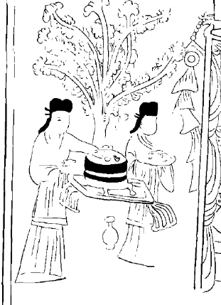 一、条形凭几又有单足凭几和栅足凭几两种。单足凭几[9](图七),出土于信阳楚墓二号墓,彩绘嵌玉几,侧面看呈“H”形,由两块立板和一块横板组成,通体髹黑漆,周沿绘朱色卷云纹。立板的外面和横板的侧壁上均匀的镶嵌着白玉二十块。将玉石镶嵌到彩绘木漆器上的做法,在战国颇为少见。栅足几相对于单足凭几来说,几面的两侧分别有多条足。例如,信阳楚墓二号墓(图八),几面长57厘米,宽18-23厘米,高48厘米。与一号墓出土的雕花木几相同,通体髹黑漆,几面两端翘起,并浮雕饕餮纹,下面各附一排四棱形横跗的几足。栅足几面较宽,用以置物极为方便,功用与案子相同。例如,大同智家堡北魏墓石椁壁画中(图九),墓主人西侧的两位侍女,一前一后,二人身前有一栅足几或称作案,上置三足樽,樽内置酒具