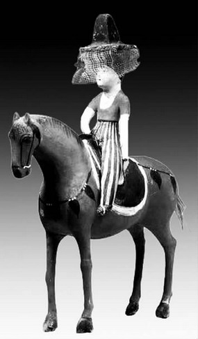 图三 1972年吐鲁番阿斯塔纳187号墓出土戴帏帽骑马女俑,现藏新疆维吾尔自治区博物馆
