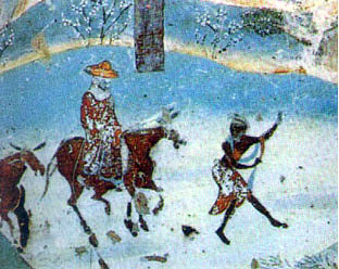 在唐代统治者喜好狩猎,狩猎时大多骑马,随身鹰犬猎豹等,据《新唐书》记载,滕王元婴亦好狩猎,沉迷游猎往往深夜不归。不仅男子打猎,从出土资料来看女子也骑马参与到打猎中。1992年西安东郊发掘了唐金乡县主墓。金乡县主是滕王李元婴的第三女,墓道的东西两个壁共出土了8件骑马狩猎女俑。(图十五)