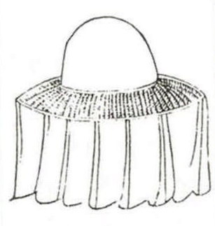 羃篱,最早应起源于古代阿拉伯地区,经西域传入我国,主要流行于北朝、隋及初唐时期。其形制有两种,一种全身障蔽类似斗篷;一种与衣帽相连,只留出面孔,是所谓“大头长裙帽”。北魏时的吐谷浑“多以帷幂为冠”,南北朝时河南国“有青海……著小袖袍……大头长裙帽”,此帷幂及大头长裙帽即为羃篱无疑;当时的吐谷浑“王公贵人多带幂篱”;唐代西域地区仍然流行披罗锻、蒙黑巾戴羃篱,如骠国女子“衣青婆裙,披罗缎”,康国女子“蒙黑巾”,吐谷浑男子“通服长裙、缯帽,或戴幂篱 [2]。《隋书 • 文四子传 • 秦孝王俊》:“俊有巧思......为妃作七宝幂篱。”[3]顾起元《说略》有载,“羃蓠,按实录曰:本羌人之首服,以羊毛为之,谓之毡帽。至秦汉,中华竞服之。后以故席为骨而鞔之,谓之席帽。”[4]陕西昭陵博物馆的燕妃墓后甬道南口西侧有一个手捧羃篱的女侍图。(图一)此图向我们展示的羃篱样式为上面为一个竹做的斗笠,下缀透明的沙布之类。整体较长基本可覆盖全身。和文献上描述的羃篱基本一致。其主要功能仍然为防风沙和遮阳,充分体现了其实用性。