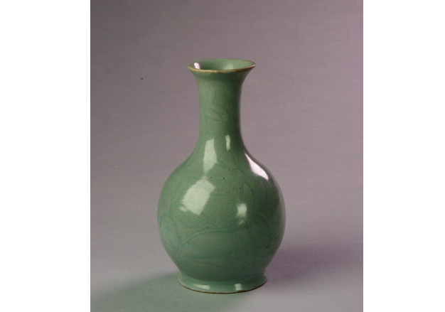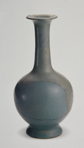 天蓝釉细颈小口瓶(图9),高20厘米、口径5.4、足径6.4。敞口折沿,长细颈,鼓腹,圈足。全器满釉,釉色天蓝,釉层匀净,光亮莹润,制作讲究。