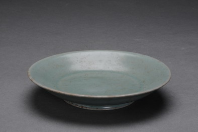 天青釉盘(图8),高3.2、口径17、足径9厘米。侈口,浅腹,下有外裹足。满烧支釉,底有三个细小支钉痕。器表开片密布。釉色天青莹润如玉。