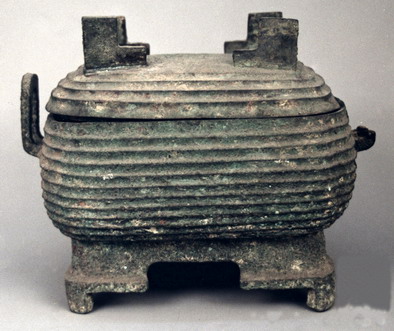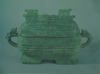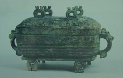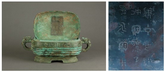 1977年,山东省曲阜鲁国故城乙组墓地30号墓出土的鲁伯余盨(图十五),西周晚期,器呈圆角椭方形,敛口鼓腹,兽首双耳,圈足外侈,四边均有长方形缺口。有盖,盖上有矩形钮,盖中部又有一虎形钮。盖沿、口沿和圈足饰窃曲纹,腹饰瓦纹,盖饰夔龙纹扉,盖底对铭各6行36字。