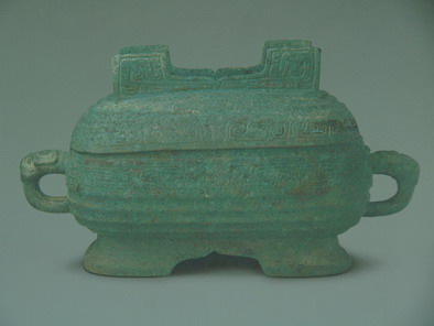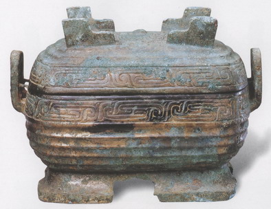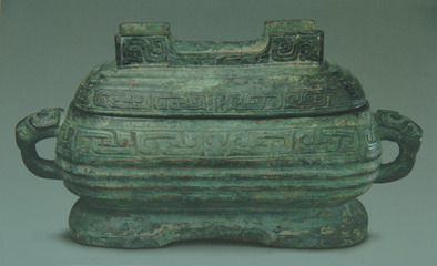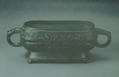 北京故宫博物院藏的圃盨(图十七),西周晚期器。器作长方形,圆角,腹壁下收。附耳,耳与器身有两小横梁相连。圈足外侈。盖可却置,有两凹形执手。盖沿及口沿周圈饰窃曲纹,余饰瓦棱纹。器盖对铭15字,记圃作此盨。