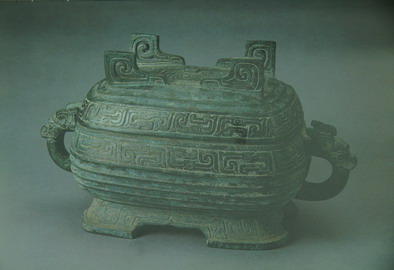 1976年,陕西扶风县云塘村西周窖藏出土的4件西周晚期伯多父盨(图十三),形制、纹饰、铭文基本相同。椭方形,龙首形双耳,盖上有四个矩尺形钮,透雕雷纹,圈足外侈,下有壸门式缺。盖沿和器口沿饰窃曲纹,盖頂饰首目交连纹。器腹及盖铸平行沟纹。盖器对铭10字记伯多父作器。