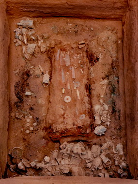 棺罩上及其周围有铜铃、铜鱼、石贝、陶珠等,其上均有穿孔。此外棺罩范围内有几处丝织物与麻布痕迹。
