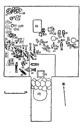 该墓内的随葬品被盗扰严重,器物零乱,大多失去原位或残破。但出土物仍很丰富,达90余件(图2)。音乐文物方面也有重大发现,出土女乐俑6件、舞俑1件。所出土的乐俑3件一组跽坐于一块长方形托板上,底板长约36.1厘米、宽11.6厘米;俑高13-17厘米。乐俑的帔帛和衣饰上分别施红、绿、酱褐色彩绘,彩绘色彩饱满。