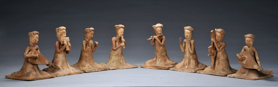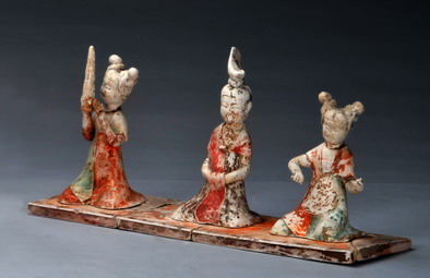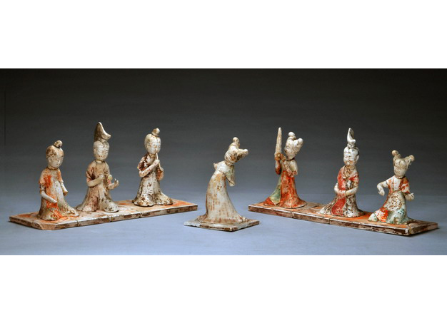 北窑湾唐墓出土绘彩伎乐俑一组(7件),唐代。俑高13.0-17.0厘米;底板长36.1厘米、宽11.6厘米。1992年11月河南巩义市北窑湾唐墓出土,现藏河南省文物考古研究院。