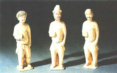 中原地区众多的音乐考古成果,向我们传递了汉唐时期中原与西域音乐文化交流的历史。本文所述的这组乐俑同墓也出土了胡人俑3件。(图5)“胡人”以及多种多样的西域乐器,大量的发现在各种遗物上,为我们研究、了解抑或复原这一时期的音乐艺术,提供了翔实的实物依据。