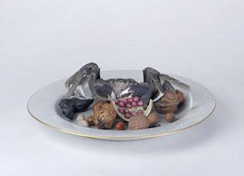 清乾隆款粉彩果品盘[4](图5),高6.5厘米、口径22厘米、足径12.3厘米,现藏北京故宫博物院。盘折沿、浅腹,圈足。螃蟹、荔枝、红枣、花生,核桃、瓜子、石榴,菱角等安置在白釉金边的盘子里,各色具备,既热热闹闹的突出了生活,又在不经意间流露出奢华。