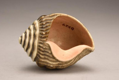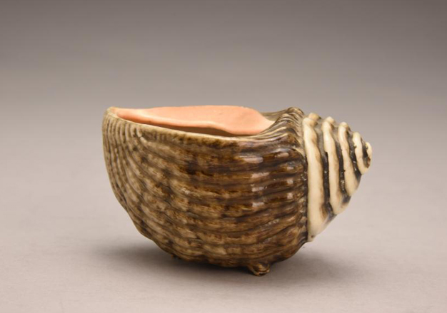 这是一件模仿天然海螺的像生瓷。整体为仿自然海螺式,螺尖部略凸,五级螺旋状的螺层。内施釉呈杏红色,釉质光滑,似乎有珍珠般的光泽。外部施釉呈灰色、褐色,深浅不一,并在视觉上有贝壳的光泽。具有排列整齐而平的螺肋和细沟,逼真生动。底部有乳状三足,以稳定杯体。口部呈不规则的椭圆形,似乎刚刚被人取出螺肉。在形、色和质感上的高度逼真,栩栩如生。把口部贴在耳朵上,也会像真的海螺一样,能听到大海的声音。亦可以作水丞或者赏玩摆设之物。