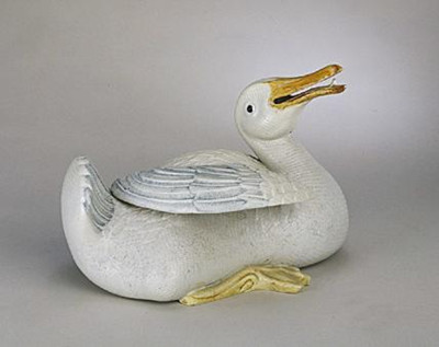 清乾隆粉彩雕瓷鸭[5](图6),高9.4厘米,通长27厘米,现藏故宫博物院。