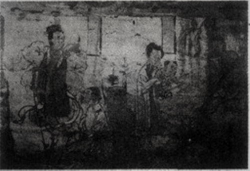 1931年在洛阳故城北半坡出土了“魏横野将军甄官主簿宁懋石室”[9],石室内有榜题孝子孝义故事多幅,其中有“董永看父助时”图,现陈列于美国波士顿博物馆。在我国甘肃会宁、陇西、永登连城宋墓及山西潞城县北关宋墓中也出土了大量绘有董永故事的画像砖和壁画。辽金时代董永故事传播到了少数民族地区。在辽宁辽阳县金厂辽墓、辽宁鞍山汪家峪辽墓、鞍山羊耳峪辽墓、山西闻喜县下阳村金明昌二年壁画墓中,均绘有董永故事。[10](图3)