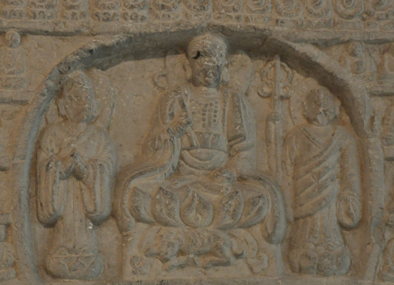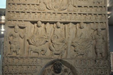 图五  碑阳第二层,文殊、观音和普贤三尊菩萨与天王造像