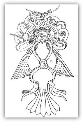 迦楼罗是佛教天龙八部众之一,汉译《金翅鸟》,相传为印度毗湿奴天神的坐骑。《妙法莲花经文句》卷二下解译:“迦楼罗,此云金翅,翅翮金色,居天下大树上,两翅相去三百三十六万……亦称为凤凰”,佛经上说迦楼罗住在龙宫靠吃龙为生,后归依佛教,成了佛的护法神[5]。它的形象通常为鸟首人身或头戴鸟冠的武士形象来表现(图十一)。云岗石窟九、十窟外室东西上层的屋形龛、正脊中间的鸟即为此金翅鸟。在莫高窟第360窟的藻井中心和第445窟南壁阿弥陀佛经变中有唐代迦楼罗的形象。