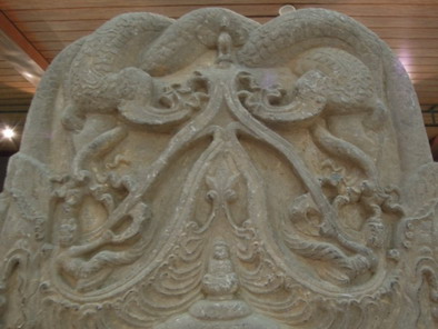 碑额的额中有一小龛,小龛由龙爪持一宝珠在中心处与龙体组成,小龛内雕观音菩萨,戴冠,胸饰璎珞,一腿横盘,一腿下垂,半跏趺坐于椭圆形宝座上,神情自若。其右侧为善财童子,面向观音, 双膝跪地膜拜,帛带上扬于头顶呈圆环状。据佛经上说,善财童子曾在普陀山拜谒观音菩萨,并得到指点教化,后来随侍在观音菩萨身边。此碑额的上部还雕有行走状的鱼篮观音。(图一)。