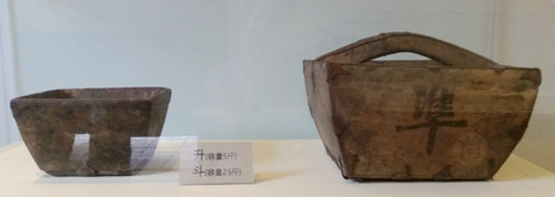 升和斗是最基本的容量器具。当时交纳税粮或民间交易都是用量器而不用衡器。图3中的升是豫西南地区按清制5斤小麦为1升制作,10升为1斗,50斤。此斗为5升斗,亦即量两次为1斗。但在实际运用中,因粮食品质不同而有差别。量时因虚实不同,晃动或脚踢,堆积淋尖不同,量出的结果就不同。于是就出现了“概”,即一用木板做成的直板,在斗的梁和沿上刮一下表示公平。过去征收税粮或粮行斗把子常常用脚踢淋尖盘剥百姓,溢下的粮食,不让本主收回,而由斗把子或相关人员分肥。按照图1中斗的容量计算,1石=10斗=100升=1000合=500斤。道光时内乡知县熊廷基,为打击不法商贩从中渔利,打制一石斗支立于粮行,其量值就是容小麦50斤,经实测,容小麦29.4公斤,基本符合清制50斤通用斗量。