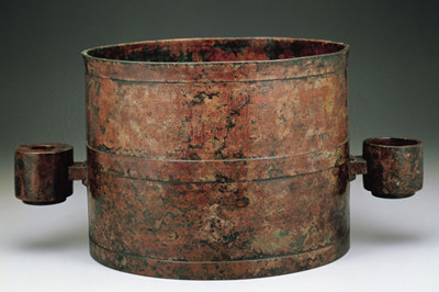 汉代继承和发展了秦代的度量衡制度。对度量衡的材质也做了明确的规定。《汉书·律历志》中记载:“凡律度量衡用铜者,名自名也,所以同天下,齐风俗也。铜为物之至精,不为燥湿寒暑变其节,不为风雨暴露改其形”。可见青铜是当时制器的上等材料,事实上所能完好保存至今的度量衡器,也确实多为青铜制品。今藏台北故宫博物院的“新莽嘉量”(图4、5),就是一件五量合一的铜制标准量器。量器的主体部分是一个大圆柱体,近下端有底,底上方是斛量,下方是斗量;右侧是一个小圆柱体,为升量;器底在下沿,右侧也是一个小圆柱体,上为合(ge)量;底在中端,下为龠;故斛、升、合三量口朝上,斗、龠二量口朝下。汉代新莽“始建国”时,遵从旧制,重铸度量器,称之为“嘉量”。其中,“嘉”是好的意思,“嘉量”就是指这是当时的标准量器。新莽嘉量 是公元9年制造的标准量器,通过对器物和铭文的研究和测量,还可以得出度量衡三者的单位量值,在中国度量衡史上具有重要的地位。